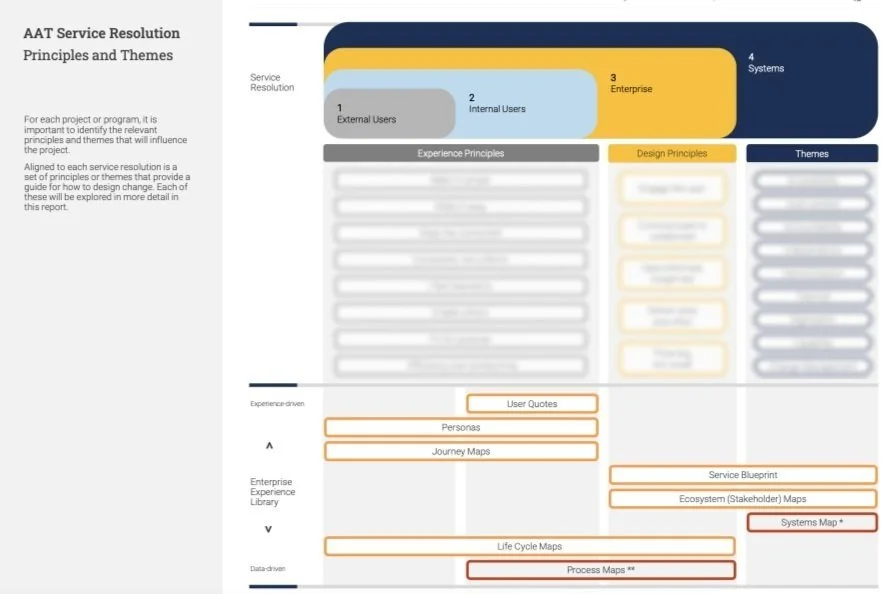 The application of experience principles, design principles and themes were explained through a model of ‘Service Resolution’. The analogy of resolution was central to our research approach that focussed on the need to zoom in and out of the problem space. The highest resolution focused on the specific experience principles for each user group whilst the themes took a holistic systems lens across the organisation and i’s broader context. Describing the relationship of these resolutions to the design artefacts helped us to articulate the purpose and limitations of each typology and emphasised the interplay of artefacts to tell a comprehensive story of the enterprise experience at different scales.
